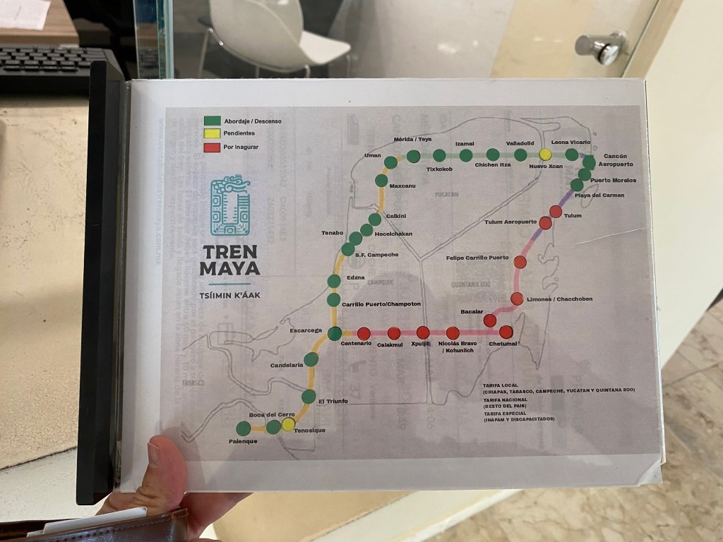 The capital of the state of Yucatan, Merida has 2 Maya Train stations: Teya and Uman. From these two stations you can travel throughout several southeastern Mexican states incluing the resort city of Cancun (in the state of Quintana Roo) and the pyramids of Palenque (in the state of Chiapas). You can currently travel around the Yucatan Peninsula within the Maya Train stations marked in green.